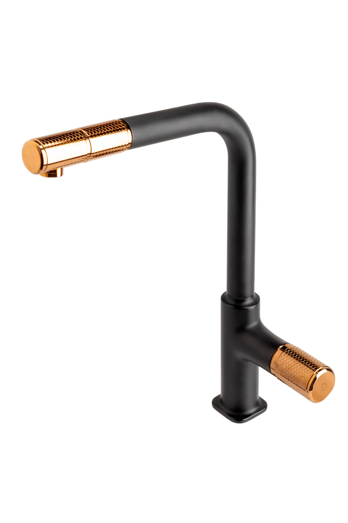 Bateria pentru chiuveta, din seria ARDESIA, este un exemplu perfect al tendintei moderne in designul bateriilor, care se caracterizeaza printr-o forma originala inspirata din geometrie, solutii functionale si un finisaj estetic in negru mat cu accente rose gold. Manerul de tip joystick va permite sa setati liber debitul dorit si sa utilizati apa in mod economic, iar pipa pivotanta si extractibila garanteaza confortul in utilizare. Mai mult, prin designul si durabilitatea sa, bateria va fi un decor unic al bucatariei, construind un aspect armonios, mai ales daca este asortata cu o chiuveta din granit, in nuanta grafit sau grafit stralucitor, sau cu un model din otel inoxidabil.