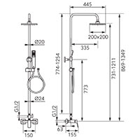 Duș fix: bară metalică de duş culisantă, 774 – 1254 mm cap duș fix SLIM din inox de 200 x 200 mm articulație sferică pentru reglarea unghiului de stropire FerroEasyClean - sistem de îndepărtare ușoară a depunerilor de calcar comutator de duș metalic cu cartuș ceramic Duș mobil: pară de duș cu 1 funcție: ploaie suport glisant cu unghi reglabil pentru para de duș FerroEasyClean - sistem de îndepărtare ușoară a depunerilor de calcar furtun de duș din PVC de 150 cm racord furtun D1/2” Baterie duș: baterie cu limitator debit apă și cartuș ceramic de 25 mm montare pe perete racord excentric D1/2” distanță 150 ± 20 mm racord duș D1/2” - ieșire laterală