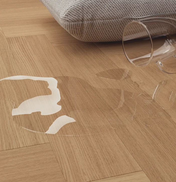 Tehnologia Smart Wood optimizează utilizarea stratului superior din lemn nobil, integrându-l într-o structură stratificată stabilă, potrivită pentru proiecte rezidențiale și comerciale cu trafic moderat.