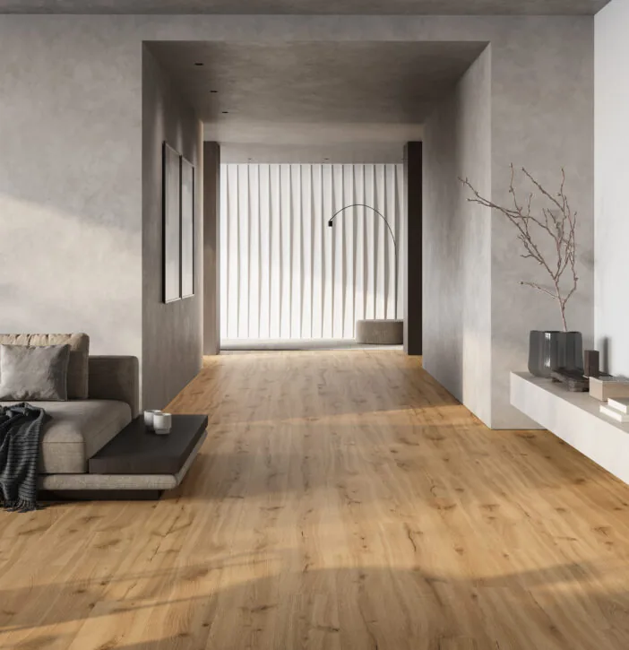 Aspectul natural de stejar auriu contribuie la crearea unui ambient cald și primitor, potrivit atât pentru locuințe, cât și pentru spații comerciale moderne. Întreținerea este simplă, iar suprafața rezistentă la uzură menține aspectul estetic pe termen lung.