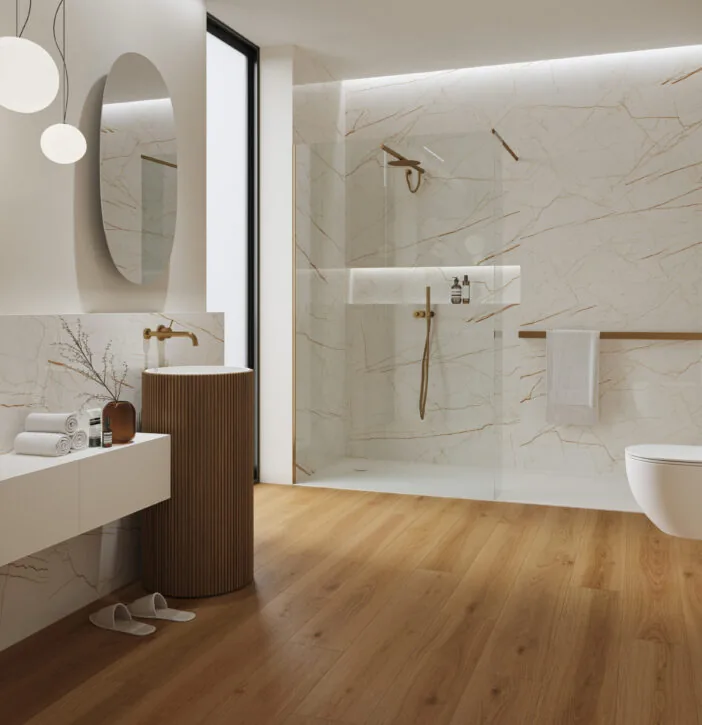 Se integrează armonios cu plinte din MDF sau PVC, uși interioare premium și finisaje precum microciment decorativ sau vopsele lavabile în tonuri calde și neutre. Produsul este compatibil cu sisteme de încălzire în pardoseală, cu respectarea indicațiilor tehnice. Se recomandă montaj pe suport plan, uscat și utilizarea unui substrat compatibil pentru optimizarea confortului acustic.