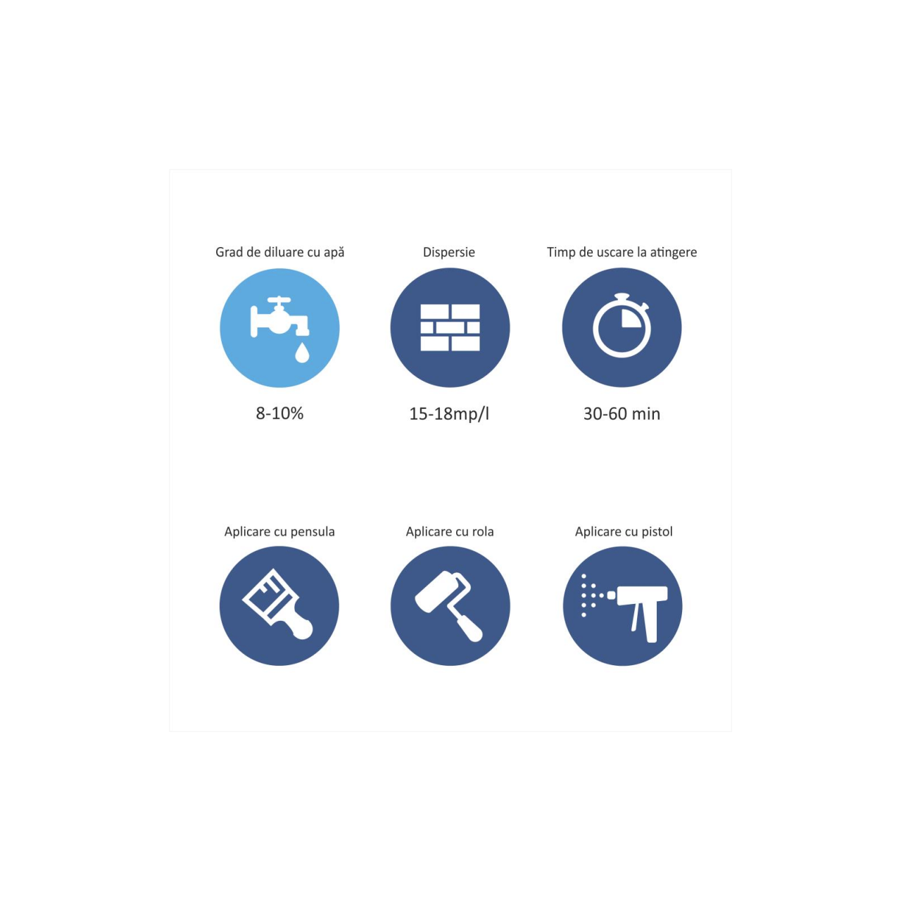 Aplicare: Se amestecă bine înainte de utilizare. Se aplică două straturi cu trafaletul, pensula sau prin pulverizare diluat până la 10% cu apă. Nu se aplică la temperaturi sub 5°C, peste 35°C și/sau umiditate relativă peste 80%. Este uscat la atingere după 30-60 de minute și poate fi reaplicat după 3-4 ore. Timpul de uscare depinde de condițiile meteorologice (umiditate și temperatură). Se spală ușor cu apă, folosind un burete moale, în caz de pete folosiți un detergent sau săpun și apă. Uneletele trebuie curățate imediat după utilizare cu apă și dacă este necesar, cu apă și săpun sau detergent.